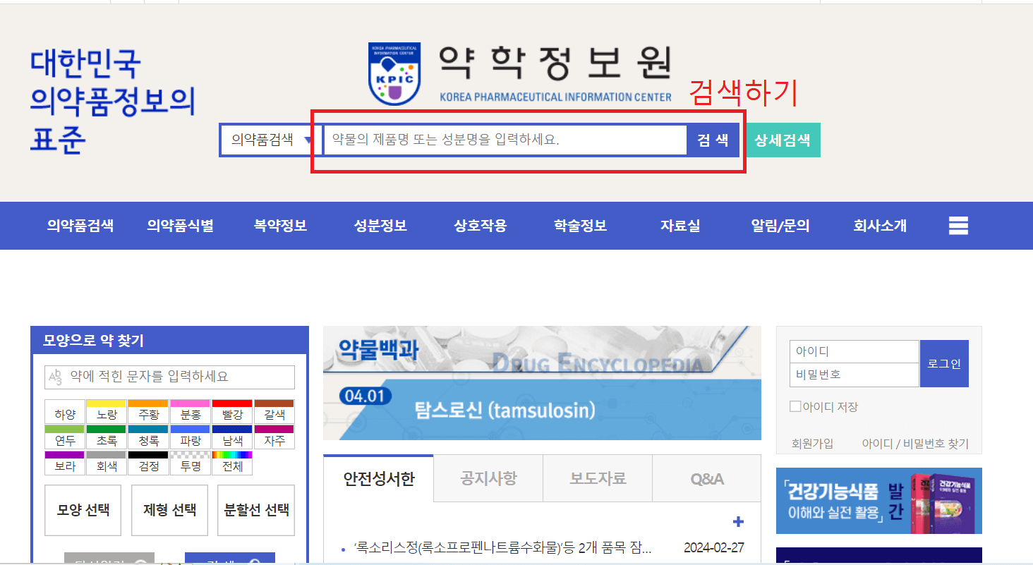 약학 정보원으로 들어가면 아래와 같이 메인 화면이 나옵니다.