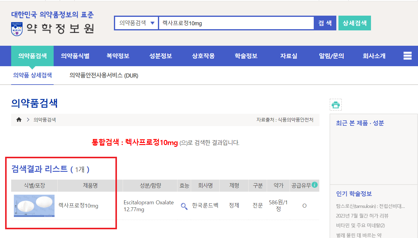 약 이름을 검색창에 입력하고 검색을 누릅니다.