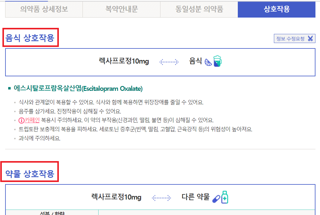 이외에도 커피, 술, 보충제 등 함께 복용 주의해야 하는 사항에 대해서도 체크해 볼 수 있습니다.